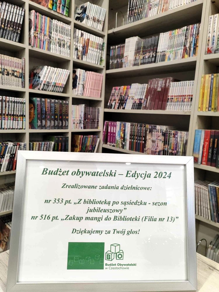 Z Biblioteką po sąsiedzku – sezon jubileuszowy. W części dedykowanej Filii nr 13 zadanie obejmowało między innymi zakup różnorodnych zbiorów oraz zestawów zabawowych dla dzieci. Filia nr 13 zrealizowała jeszcze drugie zadanie dzielnicowe: Zakup mangi do Biblioteki. Dzięki jej aktywnemu zaangażowaniu w promocję kolejnych wniosków udało się pozyskać wystarczającą ilość głosów mieszkańców, by w 2025 roku Filia nr 13 mogła realizować nowe zadania: Biblioteki Rakowa – przyjazne miejsce dla wszystkich oraz ponownie Zakup mangi do Biblioteki (Filia nr 13).